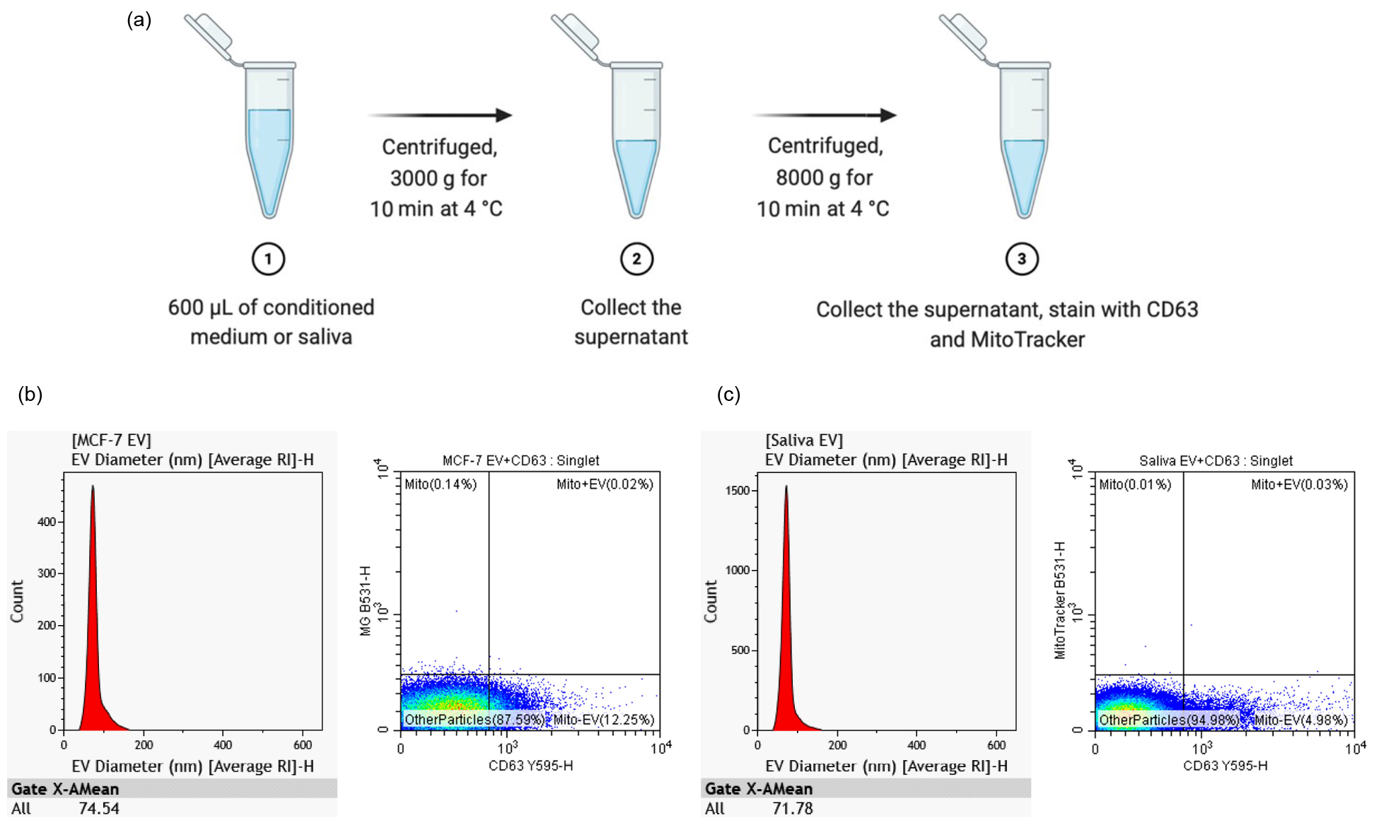 Figure 3. (a) EV isolation workflow; (b) EVs from MCF-7 conditioned medium and stained with EV marker CD63; (c) EV from saliva stained with EV marker CD63.