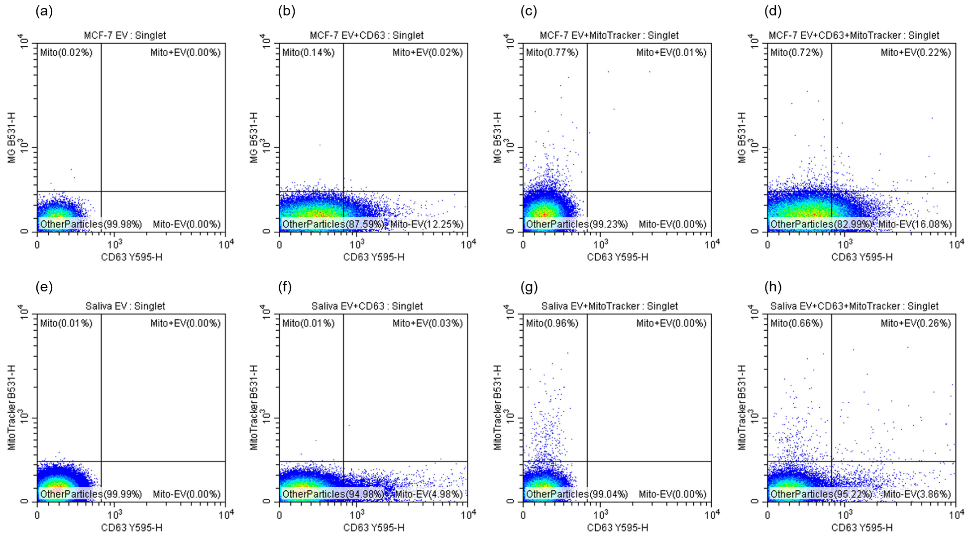 Figure 4. (a) Unstained MCF-7 EV; (b) CD63 single-stained MCF-7 EV; (c) MitoTracker single-stained MCF-7 EV; (d) CD63/MitoTracker double-stained MCF-7 EV; (e) Unstained salivary EV; (f) CD63 single-stained salivary EV; (g) MitoTracker single-stained salivary EV; (h) CD63/MitoTracker double-stained salivary EV.