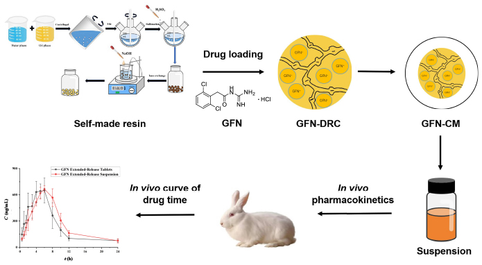 本研究在制备粒径分布窄的药用辅料阳离子交换树脂的基础上研制盐酸胍法辛缓释混悬液。采用离心界膜乳化技术对传统的悬浮聚合法进行改进, 制备粒径分布窄的阳离子交换树脂, 与市售树脂(Amberlite® IRP69)相比, 自制树脂表面光滑, Span值为0.74。以该树脂为载体, 采用静态法制备盐酸胍法辛药物树脂复合物。采用乳化溶剂挥发法制备具有缓释效果的盐酸胍法辛包衣微囊。体外释放结果显示, GFN-CM 在10 h内的释放曲线与零级释放模型拟合效果最佳, 12 h的累计释放量为81.88%。新西兰兔体内药动学实验显示, 与市售盐酸胍法辛缓释片相比, GFN缓释混悬液的MRT0–24由7.619 h延长至8.336 h, 药时曲线更加平稳, 平均相对生物利用度(Fr)为111.36%。本研究成功合成了一种粒径分布较窄的阳离子交换树脂, 为缓释给药体系的发展提供了新的思路与策略。