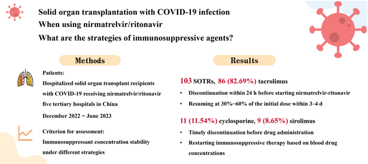 奈玛特韦-利托那韦在感染新型冠状病毒的实体器官移植患者中具有良好的疗效, 而免疫抑制剂与奈玛特韦-利托那韦存在相互作用。本研究旨在为临床应用奈玛特韦-利托那韦时免疫抑制药物的调整策略提供临床建议。我们纳入了2022年12月至2023年6月期间在五家医院接受长期免疫抑制治疗以及短期奈玛特韦-利托那韦治疗的实体器官移植受者。连续数据以四分位数范围值的中位数表示, 而分类数据则表示为具有相应百分比的计数, 所有分析均采用Python 3.12完成, 共纳入103例受者。其中, 86例使用他克莫司的患者中, 停药后24小时内开始奈玛特-利托那韦时浓度最为稳定。联合用药导致显著浓度升高, 62.5%的患者浓度增加超过50%。停药超过24小时的患者中, 26.67%的患者浓度下降超过50%。在停药后3−4天内以初始剂量的30%−60%逐渐恢复用药, 可达到稳定的他克莫司浓度。建议所有策略均需定期进行血药浓度监测。11例环孢素患者中, 1例将剂量减少至低于20%, 浓度增加超过50%;其余选择停药, 其中超过50%患者浓度下降。在第2−5天恢复用药(减少或维持原剂量)显示出稳定的浓度。9例西罗莫司患者未出现极端浓度波动。建议在奈玛特韦-利托那韦治疗前24小时停用他克莫司, 并在治疗后3−4天内以初始剂量的30%−60%恢复用药, 同时进行定期血药浓度监测。对于环孢素和西罗莫司, 在药物治疗前及时停用, 并在奈玛特韦-利托那韦停药后根据血药浓度恢复免疫抑制治疗也是安全的。