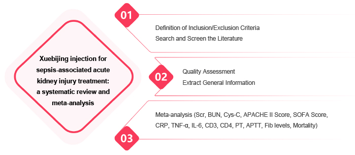 本研究旨在基于Meta分析评价血必净注射液联合CRRT治疗脓毒症所致急性肾损伤(Sepsis-associated acute kidney injury, SA-AKI)的临床疗效。在国内外数据库检索血必净注射液联合CRRT治疗SA-AKI的临床随机对照试验(randomized controlled trials, RCTs), 根据纳入和排除标准, 确定纳入的文献, 运用RevMan5.4软件对文献进行质量评估及Meta分析。共纳入20项试验, 1695例患者。结果显示, 与单纯CRRT治疗相比, 联合血必净注射液组的血清肌酐[SMD = –1.50, 95% CI (–1.89, –1.12)]、尿素氮[SMD = –1.61, 95% CI (–2.32, –0.90)]、血清胱抑素C [MD = –0.60, 95% CI (–1.05, –0.14)]; Acute Physiology And Chronic Health Evaluation Ⅱ评分(APACHE Ⅱ评分) [MD = –3.57, 95% CI (–4.73, –2.41)]、Sequential Organ Failure Assessment评分(SOFA评分)[MD = –2.46, 95% CI (–3.00, –1.92)]; 炎症指标: C反应蛋白(CRP) [SMD = –2.26, 95% CI (–2.82, –1.69)]、肿瘤坏死因子(TNF-α) [SMD = –2.45, 95% CI (–3.11, –1.79)]、白细胞介素-6 (IL-6) [SMD = –2.40, 95% CI (–3.01, –1.78)]; 免疫功能指标: CD3 [SMD = 2.79, 95% CI (1.41, 4.18)]、CD4 [SMD = 1.09, 95% CI (0.63, 1.55)]; 凝血功能指标: PT [SMD = –1.70, 95% CI (–2.46, –0.94), P < 0.0001]、APTT [SMD = –1.04, 95% CI (–1.25, –0.83), P < 0.00001]、Fib [SMD = 2.32, 95% CI (1.43, 3.21), P < 0.00001]; 死亡率[OR = 0.52, 95% CI (0.33, 0.83), P = 0.006] 均有统计学意义(P < 0.05)。脓毒症急性肾损伤在CRRT治疗的基础上联合血必净注射液治疗对肾功能的恢复、炎性因子的消除、免疫功能的改善、凝血功能的控制、死亡率的降低上明显优于单纯CRRT治疗。但由于试验整体质量不高, 仍需更多大样本、多中心、双盲的随机对照试验进一步支持。
