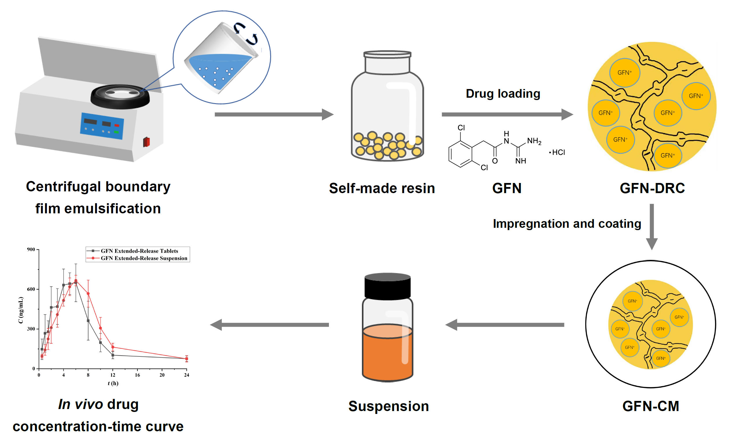 Cation exchange resin with narrow particle size distribution was prepared by centrifugal boundary film emulsification technology, and the drug-resin complex was prepared by static adsorption method using the resin as the drug carrier. Subsequently, guanfacine hydrochloride coated microcapsules (GFN-CM) were prepared by emulsion solvent evaporation technology, and a sustained-release (ER) suspension of guanfacine hydrochloride (GFN) was successfully prepared based on GFN-CM. The experimental results solidly supported a promising and scalable sodium polystyrene sulfonate resin (PSSNa) technology and advanced a novel formulation strategy for sustained-release pharmaceuticals, thus providing valuable technical insights and potential applications for future developments in pharmaceutical ER systems.
