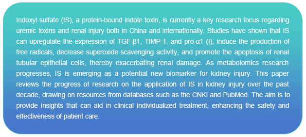 Indoxyl sulfate (IS), a protein-bound indole toxin, is currently a key research focus regarding uremic toxins and renal injury both in China and internationally. Studies have shown that IS can upregulate the expression of TGF-β1, TIMP-1, and pro-α1 (I), induce the production of free radicals, decrease superoxide scavenging activity, and promote the apoptosis of renal tubular epithelial cells, thereby exacerbating renal damage. As metabolomics research progresses, IS is emerging as a potential new biomarker for kidney injury. This paper reviews the progress of research on the application of IS in kidney injury over the past decade, drawing on resources from databases such as the CNKI and PubMed. The aim is to provide insights that can aid in clinical individualized treatment, enhancing the safety and effectiveness of patient care.